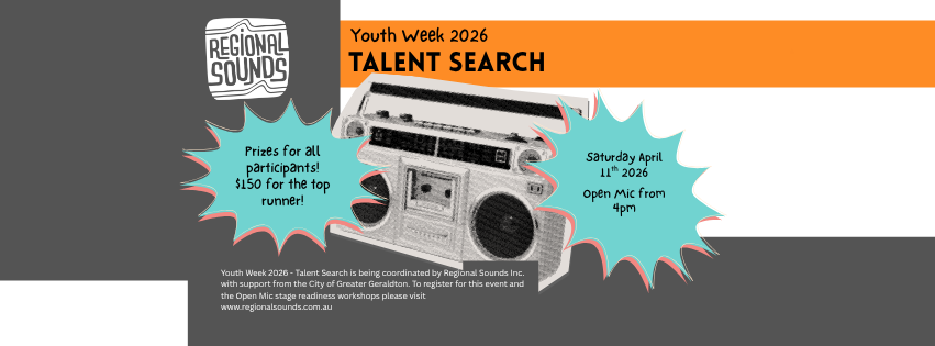 The Youth Week 2026 Talent Search is an Open Mic event to be held at the Geraldton Youth Centre on 11 April 2026. By registering for the Open Mic, you're also committed to attending atleast one Stage Readiness workshop with our mentors. MORE INFO BELOW